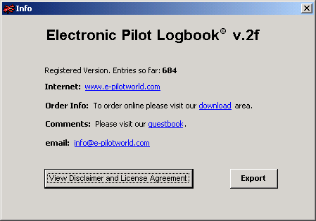 Application version, number of entries in database, support links and if in demo mode a registration button. |